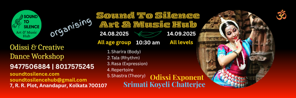 In Kolkata, we are organising the Sound To Silence Art & Music Hub powered Odissi & Creative Dance Workshop 2025 for 2 days (Sundays), on 24th August 2025 & 14th September 2025, by master teacher Odissi Exponent Smt. Koyeli Chatterjee, near Ruby Hospital – 700107.